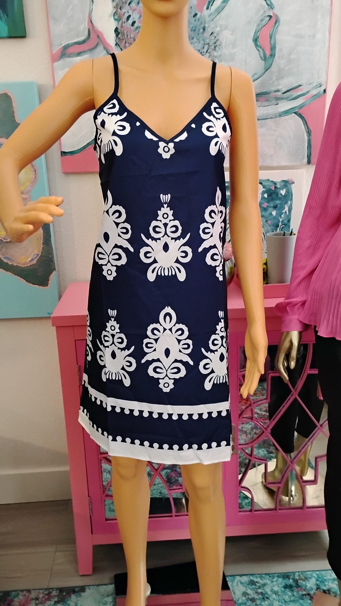 This navy slip dress features a striking white print that gives it a timeless, easygoing elegance. Designed with delicate spaghetti straps and a flattering V neckline, it offers a lightweight, flowy feel that is perfect for warm days or layered looks.
